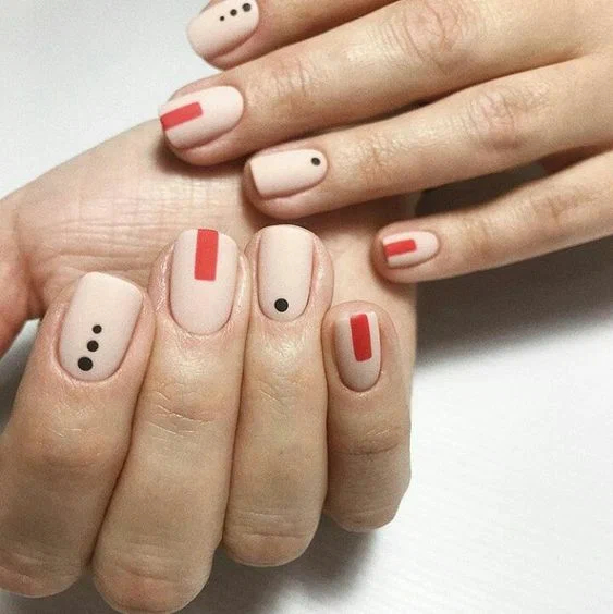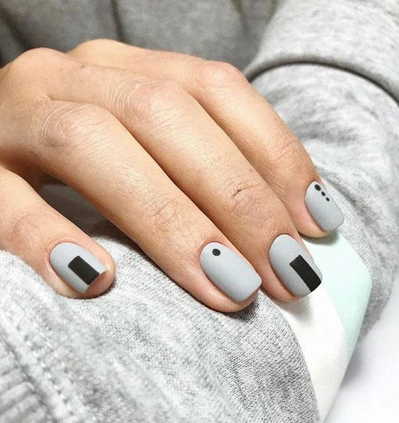 В 2022 кожна модниця просто зобов’язана спробувати зробити на короткі нігті подібний геометричний дизайн з матовим покриттям. Щоб малюнок на нігтях чітко простежувався, потрібно використовувати два контрастні лаки.