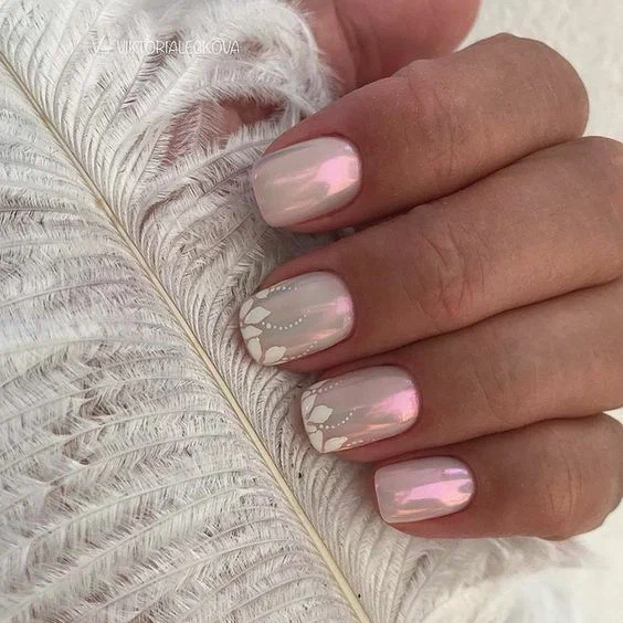 Витончений та ніжний перламутр – тренд 2022 року. Цей варіант чудово виглядає з ніжним квітковим дизайном. Перлове покриття підійде для різної форми нігтьової пластини.