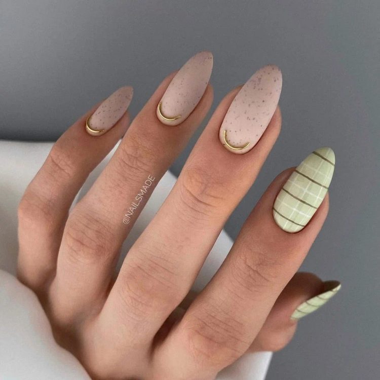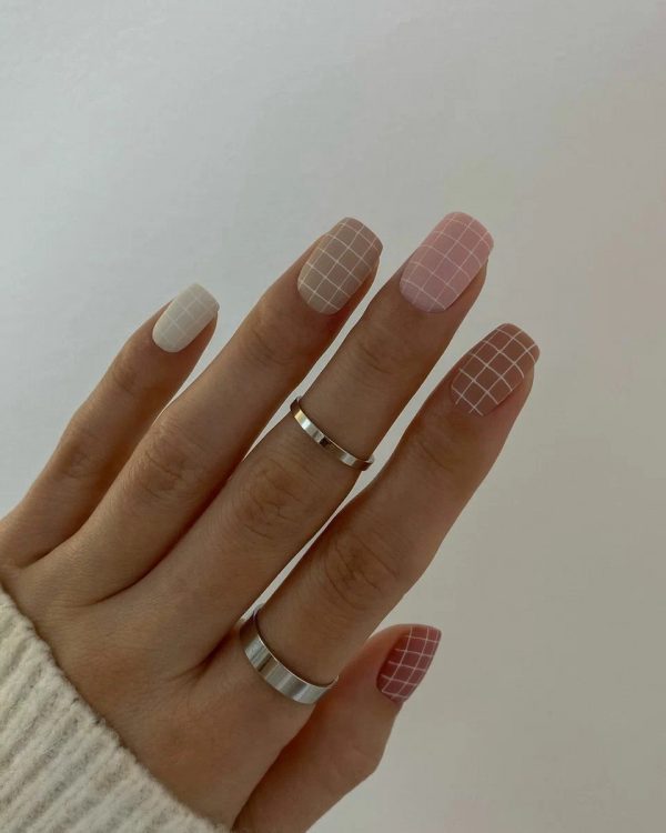 Манікюр з геометричними малюнками або лініями виглядає мінімальним у тому випадку, якщо обрана колірна гама спокійна і нейтральна. Манікюр у клітинку – тренд сезону, але пам’ятаємо про те, що він візуально може зробити нігтьову пластину ширшою.