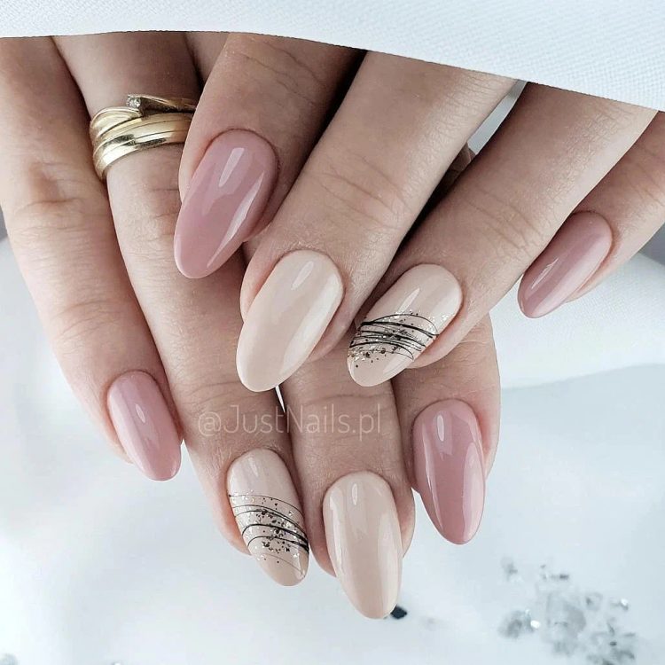 Бежеві або рожеві натуральні відтінки будуть виглядати цікавішими, якщо майстер з манікюру додасть до них трішки “інтриги” у вигляді пари блискіток і найтоншого павутиння.