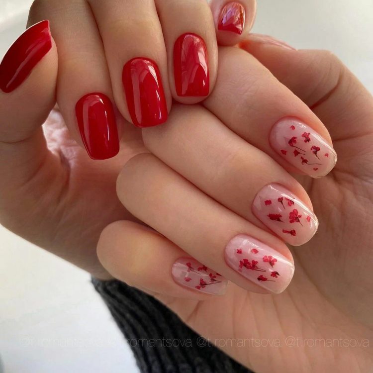 Манікюр у відтінках червоного є дуже затребуваним варіантом дизайну нігтів і деякі модниці роблять винятково його. Додавши до червоного пару квіточок, можна отримати більш динамічний весняний нейл-арт.