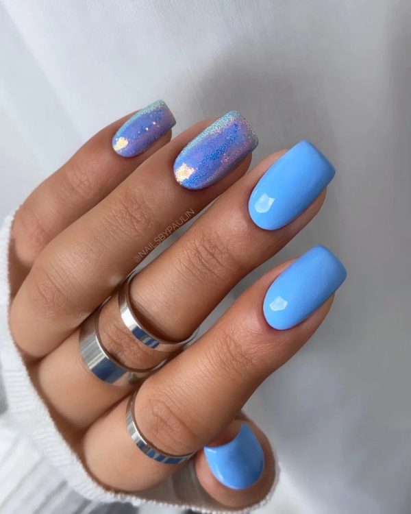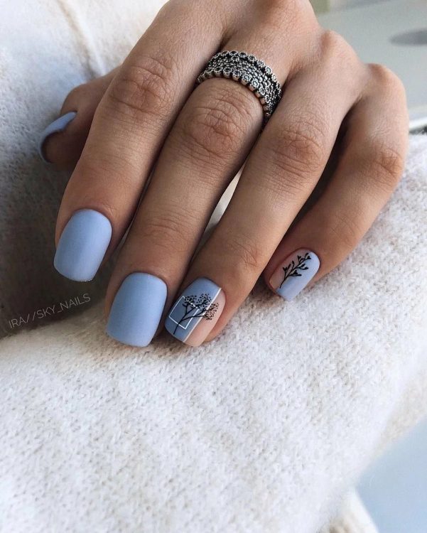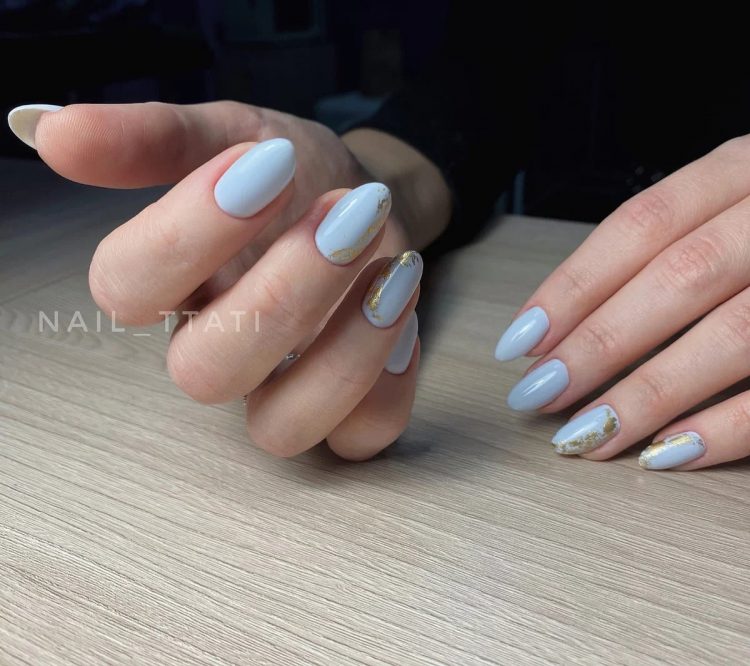 Блакитний колір чудово виглядає із золотистими чи сріблястими мотивами, незалежно від пори року. Так, якщо раніше такий варіант нейл-арту найчастіше зустрічався у зимовий сезон, то зараз його можна повторити тоді, коли заманеться.