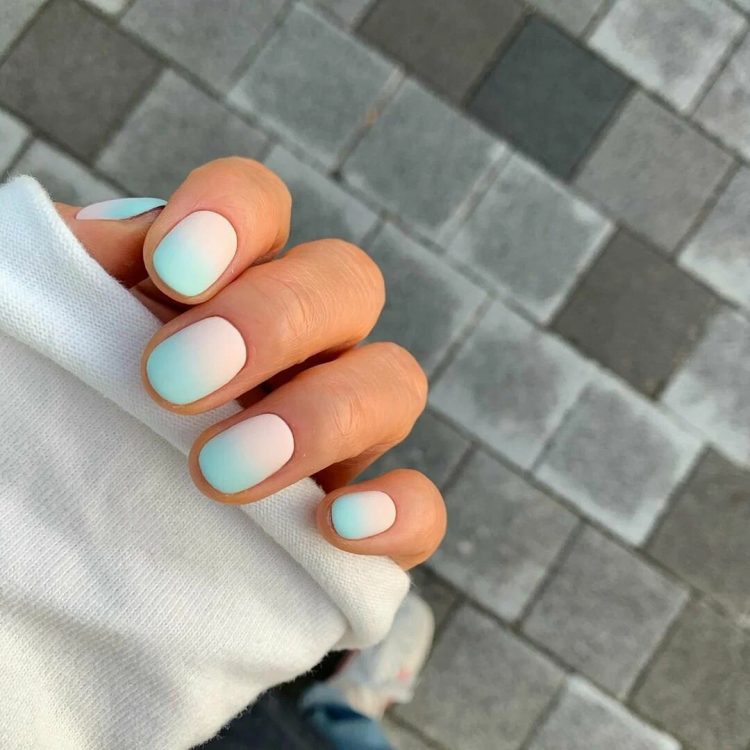 Градієнт або омбре з плавним переходом з білого/бежевого/сірого/рожевого кольору в ніжний блакитний – вибір для модниць, які люблять незвичайний, але лаконічний дизайн.