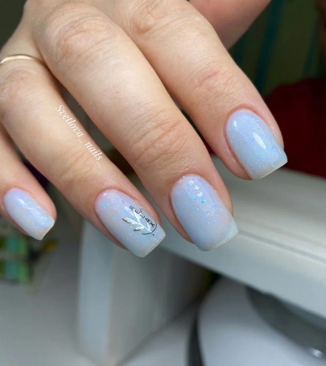 Те саме можна написати і про дизайн нігтів з ніжно-блакитними блискітками, завдяки яким нейл-арт виглядає так само загадковим, як і морська глибина.