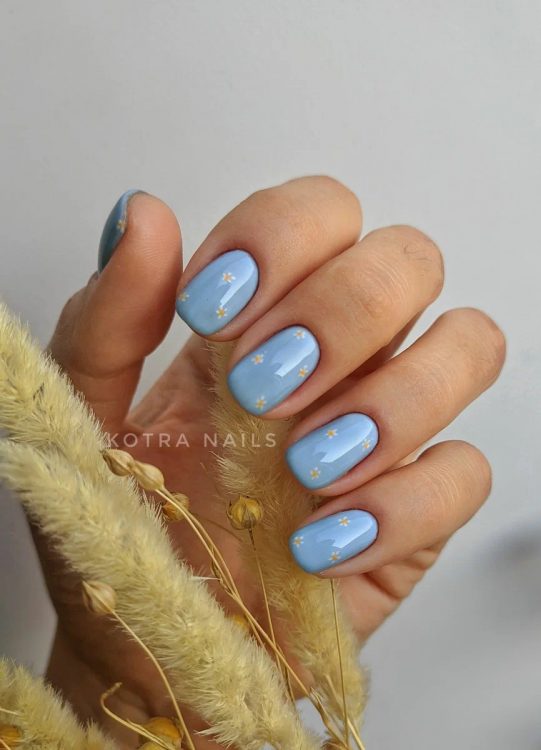 Мило, ніжно та чудово: саме так можна описати дизайн нігтів у блакитних тонах, декорований дрібними, мінімалістичними ромашками.