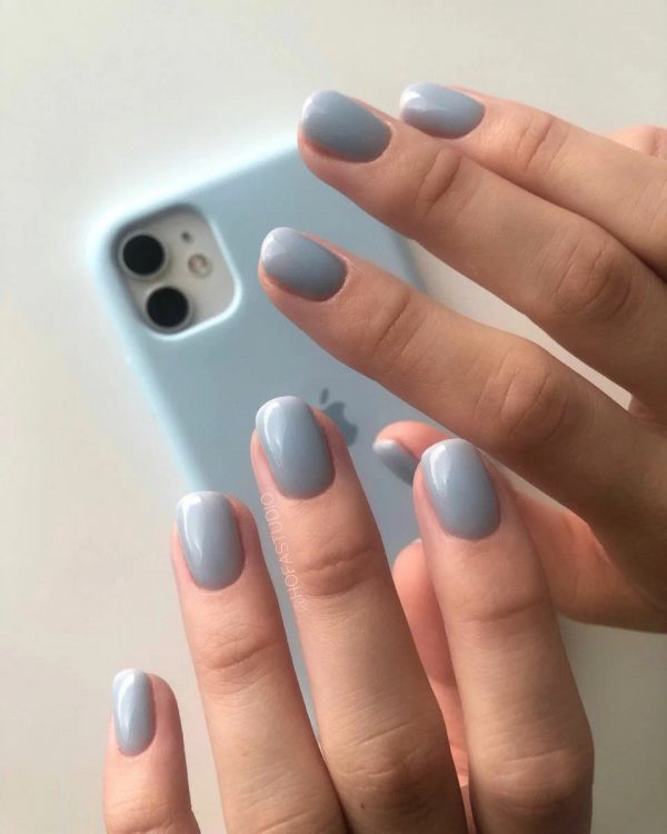 Однотонний манікюр у вибілених блакитних відтінках виглядає свіжо, стильно та лаконічно, бо пастельні блакитні тони не акцентують увагу, на відміну від яскраво-блакитних варіацій.