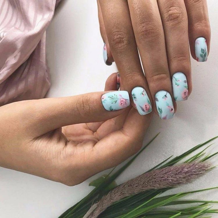 Квіткові мотиви на блакитному тлі виглядають значно ніжніше, ніж на яскравіших відтінках. Так, такий дизайн нігтів вибирають чуттєві та романтичні натури.