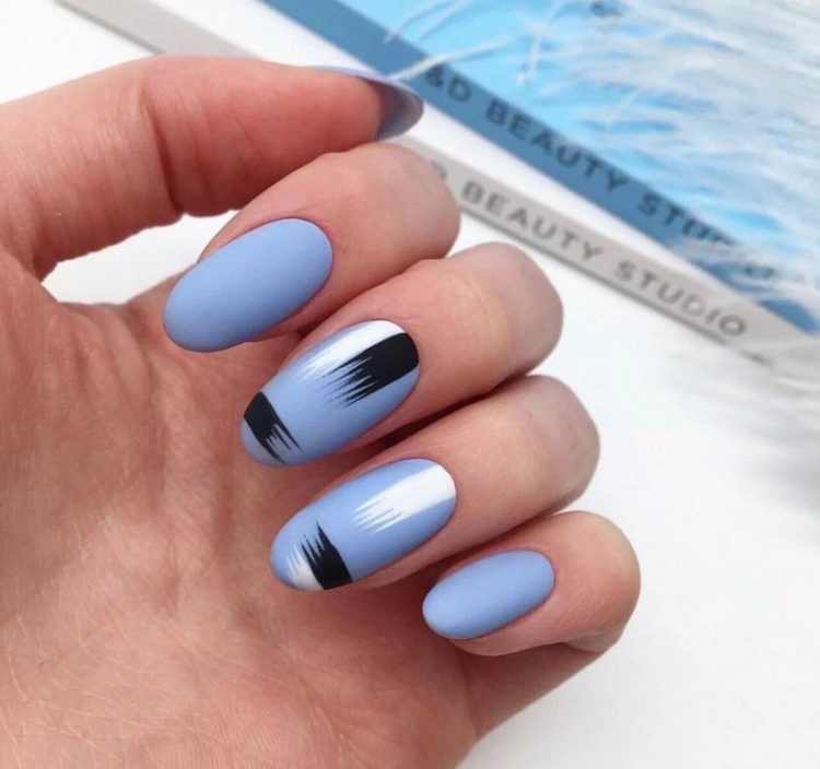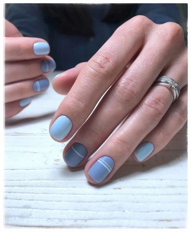 Більш яскраві та насичені блакитні відтінки варто поєднувати з нейтральними базовими, які здатні згладити яскравість та надати дизайну нігтів особливої шляхетності.