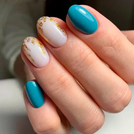 Ніжний блакитний манікюр із золотими пластівцями на коротких, овальних нігтях