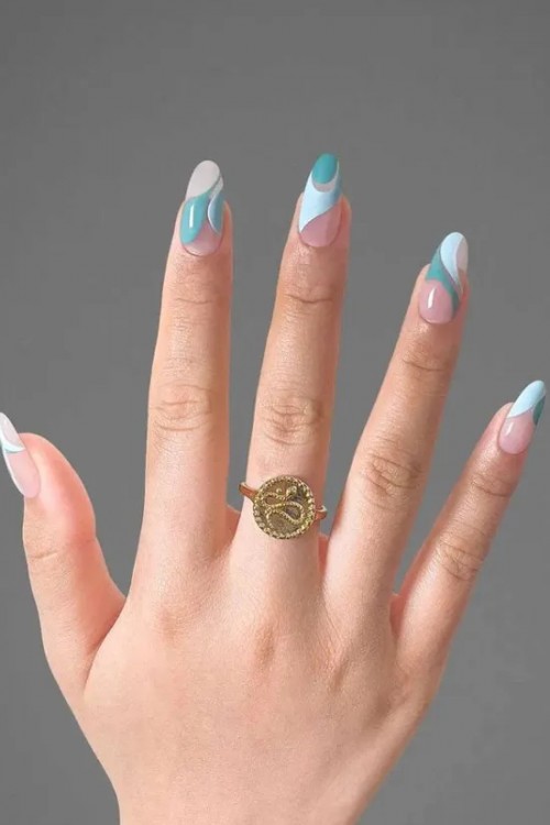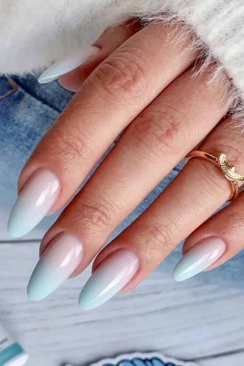 Блакитне, крижане омбре на довгих, овальних нігтях