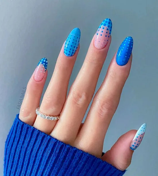 Цікавий блакитний манікюр з крапками на довгих мигдалеподібних нігтях