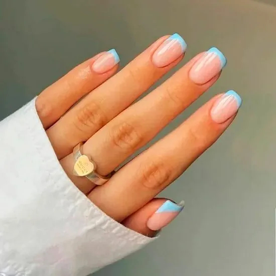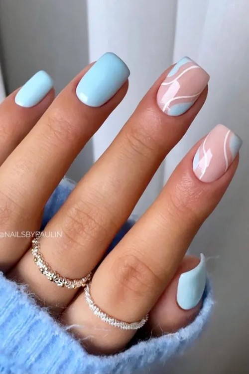 Блакитний манікюр з білими лініями на квадратних, доглянутих нігтях