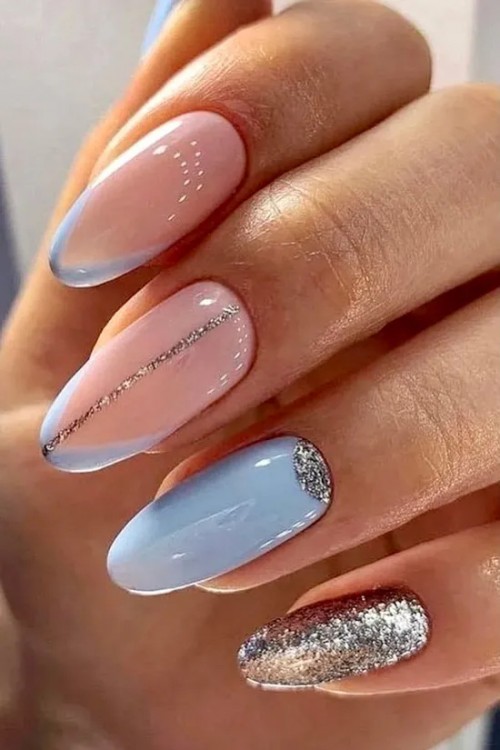 Вишуканий, блакитний манікюр зі сріблястими блискітками на довгих, овальних нігтях