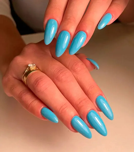 Простий, блакитний манікюр на мигдалеподібних, довгих нігтях