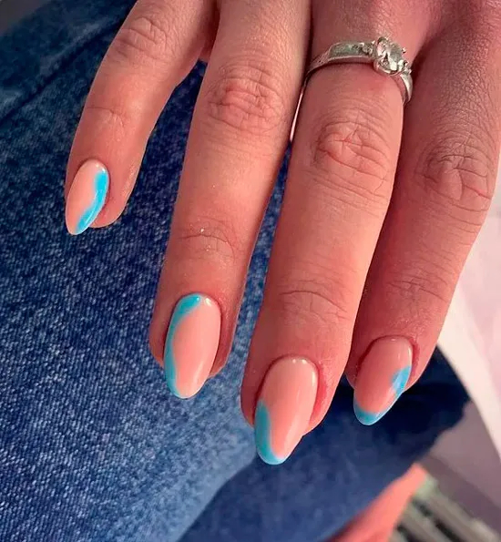 Блакитний манікюр із бежевою основою на овальних, натуральних нігтях