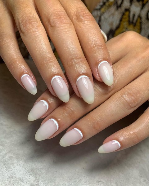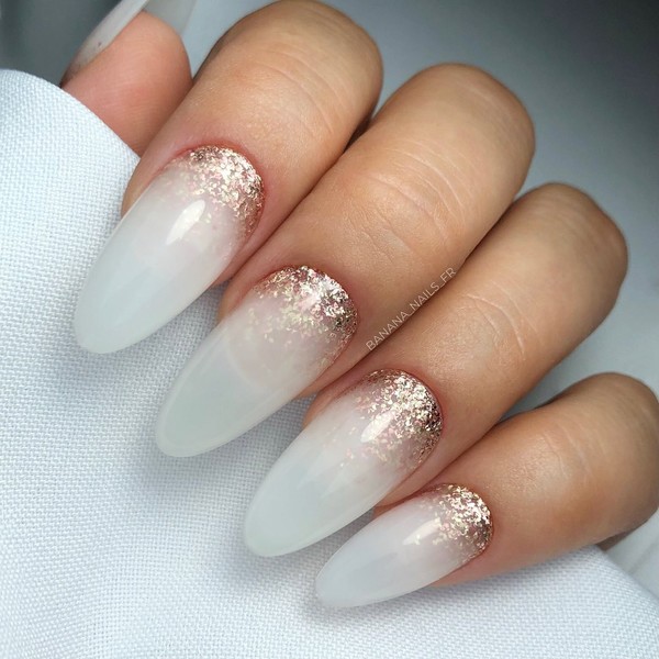 Манікюр буде виглядати цікавіше з градієнтом. Зробіть ледь помітний перехід від молочного кольору до ніжно-рожевого. Можете залишити такий варіант, а якщо хочете додати яскравості, нанесіть рожевий гліттер біля основи нігтя. Сяючий манікюр точно не залишиться непоміченим!