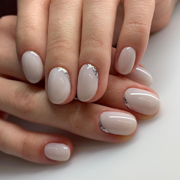 Пропонуємо урізноманітнити манікюр і додати трішки срібного гліттеру. На двох нігтях виділіть основу кутикули за допомогою блискіток. Такий мінімалістичний дизайн додасть родзинки в ваш образ!