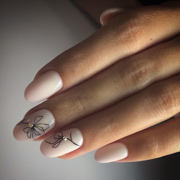 Намалюйте акуратні чорні квіти на двох нігтях і приклейте маленькі стрази. Манікюр буде виглядати неймовірно ніжно, а чорний нейл-арт додасть йому додаткової елегантності.