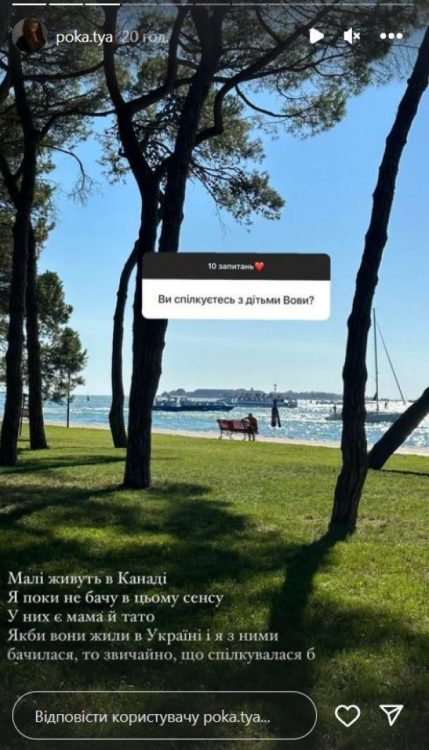 “Малі живуть в Канаді. Я поки не бачу в цьому сенсу. У них є мама й тато. Якби вони жили в Україні і я з ними бачилася, то, звичайно, що спілкувалася б”, – прокоментувала 23-річна Катерина Полтавська. Дружина Володимира Остапчука не проти спілкуватись з його дітьми. Однак, наразі блогерка не бачить в цьому сенсу.