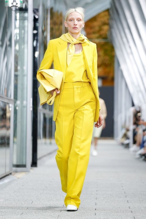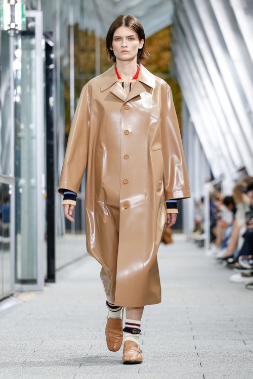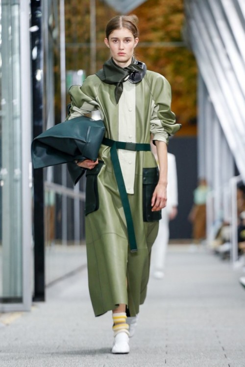 На шоу гості побачили безліч варіацій на тему монохромних образів, що складаються з ідеальних брючних костюмів, плісированих спідниць і об’ємних толстовок, а також цілий ряд витончених речей зі шкіри: довгі плащі з накладними кишенями, бермуди, фактурні поло і сорочки з геометричними вставками.