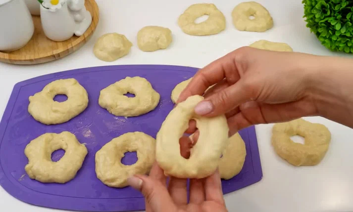 Робимо колобочки, посередині робимо отвір і розтягуємо їх, виходять такі заготовки.
