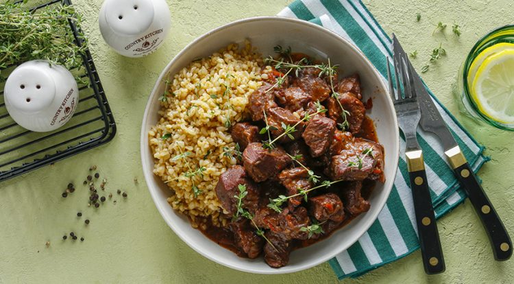Страва дуже проста у приготуванні. Тушкована свинина виходить апетитною та надзвичайно смачною. Завдяки червоному вину м’ясо має ніжний смак та чудовий аромат.