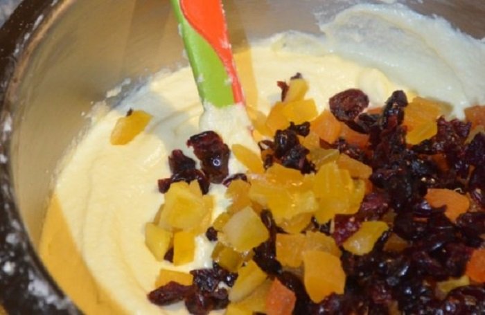 Якщо цукати тверді, залийте їх окропом і дайте постояти 15-20 хвилин. Потім цукати, журавлину і курагу дрібно наріжте.