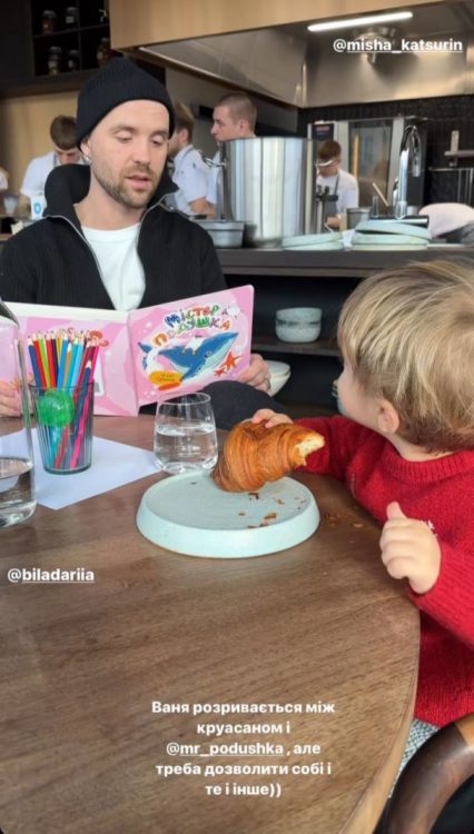 Нещодавно подружжя побувало в ресторані. Компанію їм склали син та донечка Михайла Кацуріна. 2-річний син ресторатора снідав та уважно споглядав на тата. Михайло Кацурін вирішив прочитати Івану казку. На столі також знаходилися олівці для малювання. Вочевидь, пара разом з дітьми весело провела час в очікуванні на їжу.