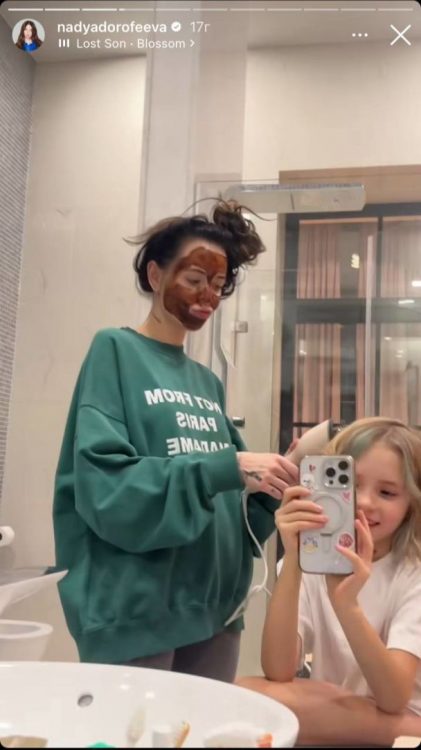 На обличчя співачка нанесла маску. Вона зібрала волосся в пучок та позувала в домашньому одязі. Схоже, Наді Дорофєєвій дуже сподобалось проводити час з донькою свого чоловіка. На фото 7-річна Саша мило усміхалась та насолоджувалась моментом. Підписники прокоментували нову публікацію співачки, засипавши її приємними словами.