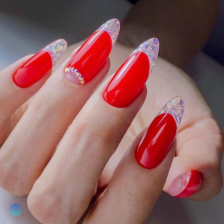 Яскраве нігтьове ложе і прозорі кінчики, виконані в техніці моделювання.