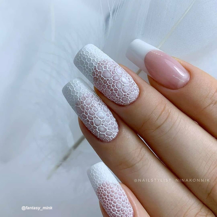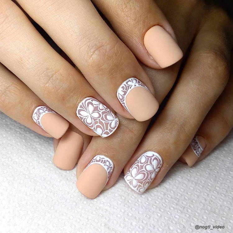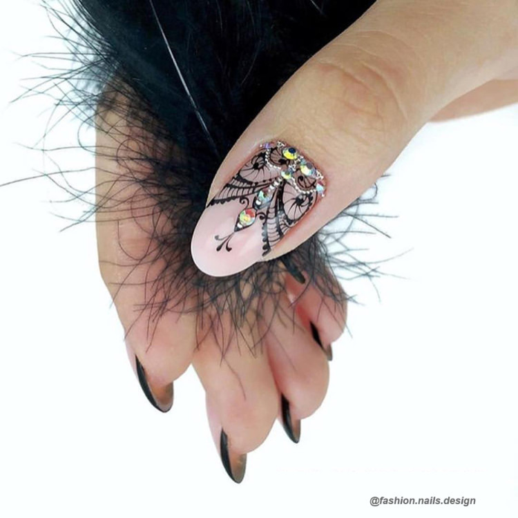 Мереживні візерунки білого або чорного кольору на прозорому покритті, вензелі та найніжніші метелики / квіточки відмінно підійдуть для весняного манікюру. Головне – не переборщити з химерністю. Нехай це будуть акуратні елементи по краю нігтя.