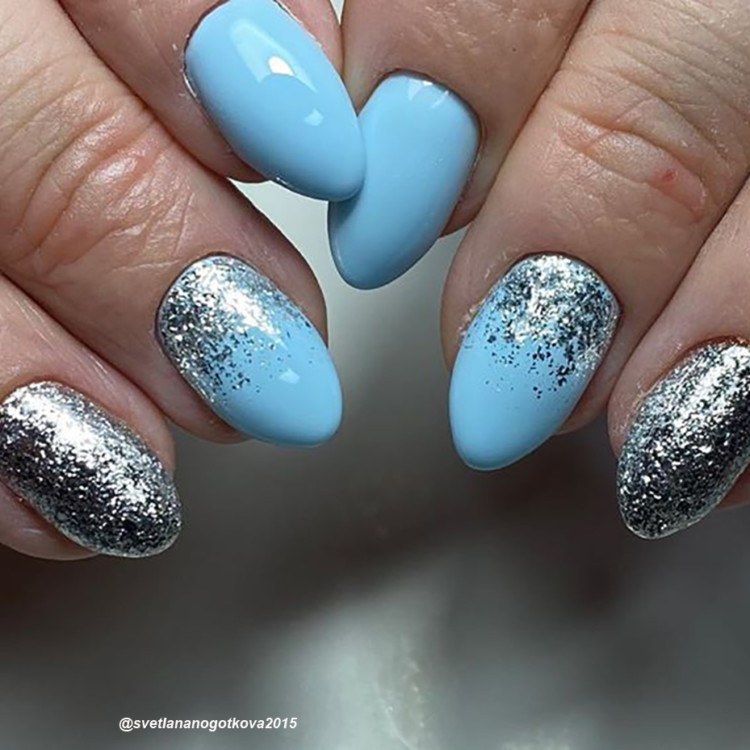 Техніка переходу від темного відтінку до світлого, добре виглядає як на волоссі, так і на нігтях. Але гра з кольором – це занадто банально. Набагато цікавіше нанести блискітки на частину нігтьової пластини (з краю або у лунки) і розтягнути до середини нігтя.