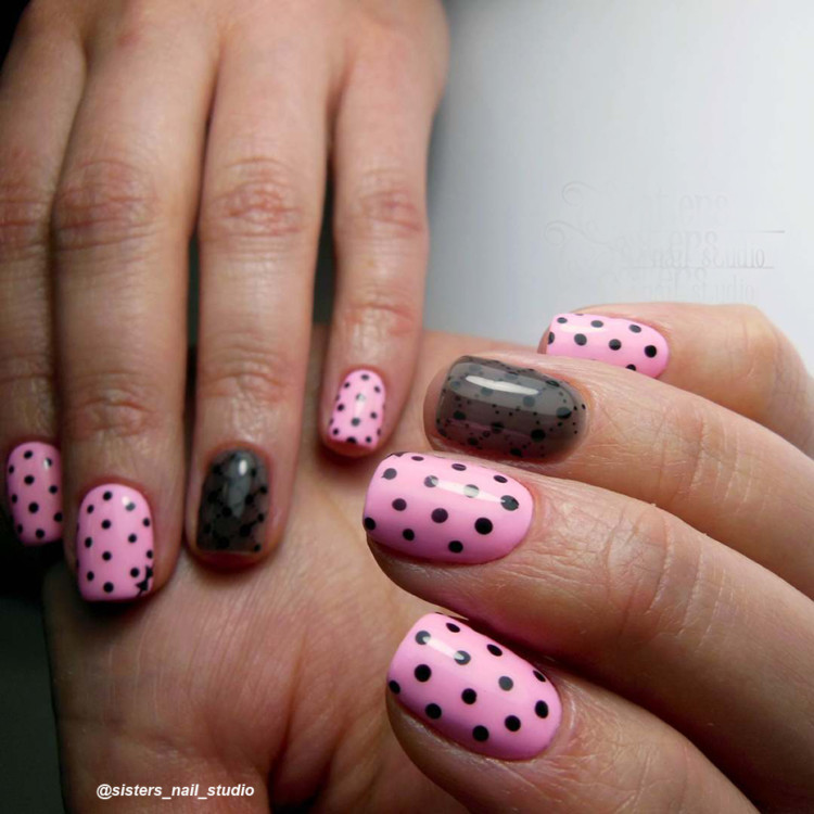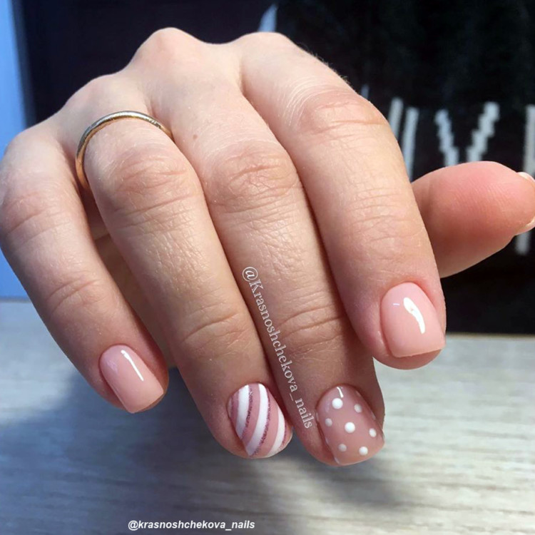 Наприклад, частина ваших нігтів пофарбована в горошок, інша частина – в смужку. Особливо цікаво це виглядає в одному відтінку, наприклад, білий на прозорому тлі.