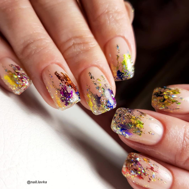 Нанесення фольги шматочками з «розтиранням» по краях, додає нігтям незвичайного виду. Кольори фольги і втірки можна вибирати будь-які, але найактуальніші золотий, срібний і голографічний. Ще одним модним варіантом буде нанесення перлової втірки на нігті з нюдовим покриттям. Це дуже ніжний дизайн.
