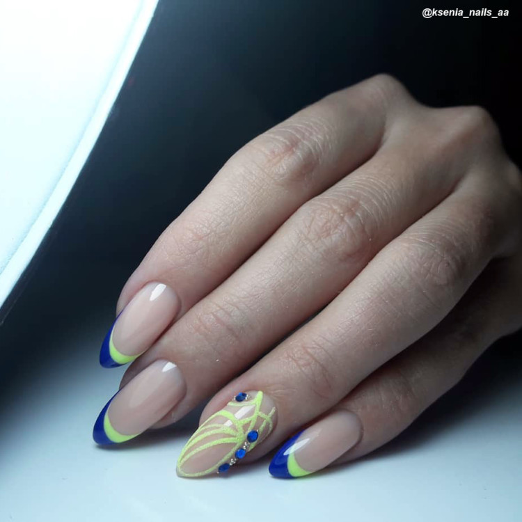 Ви можете всі нігті поділити на дві половини по всій довжині або залишити акцент на парі нігтів. Кольори можуть як близькі один до одного, так і контрастні.