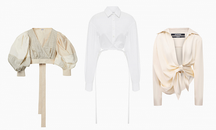 Стиліст Кім Кардаш’ян, Венеда Картер, з якою зірка Instagram почала працювати ще в 2019-му році, підібрала для Кім вкорочену блузку з вільними рукавами, глибоким вирізом і зав’язками на талії. Ми вважаємо, що така річ дуже в дусі Jacquemus і Musier і чудово підійде для літа. Носити можна, як Кардаш’ян, з мініатюрним бікіні або зі спідницею міді на стегнах.