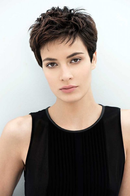 Головна відмінність цієї стрижки від піксі – більш довгі пасма біля скронь, що надає образу жіночності, незважаючи на коротку довжину волосся. Спробуйте поєднувати таку зачіску з помадою винного відтінку і беретом як у художника – і відчуєте себе героїнею французької мелодрами.