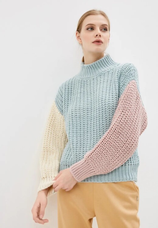 Додати кольору повсякденному образу допоможе теплий светр з високим горлом в стилі колор-блок. Наш вибір – модель з колірними блоками пастельних відтінків. Завдяки ніжним приглушеним тонам цей светр легко комбінується як з базовими, так і з трендовими, яскравими і принтованими речами. Спробуйте підібрати брюки або спідницю кольору, наявного на светрі, але на пару тонів насиченішого – так ви отримаєте цікавий, складно влаштований образ з найпростіших речей. Такий светр цілком доречний і в вечірньому вбранні: доповніть його плісированою спідницею сріблястого кольору, сумочкою з декором і об’ємними сережками-люстрами.