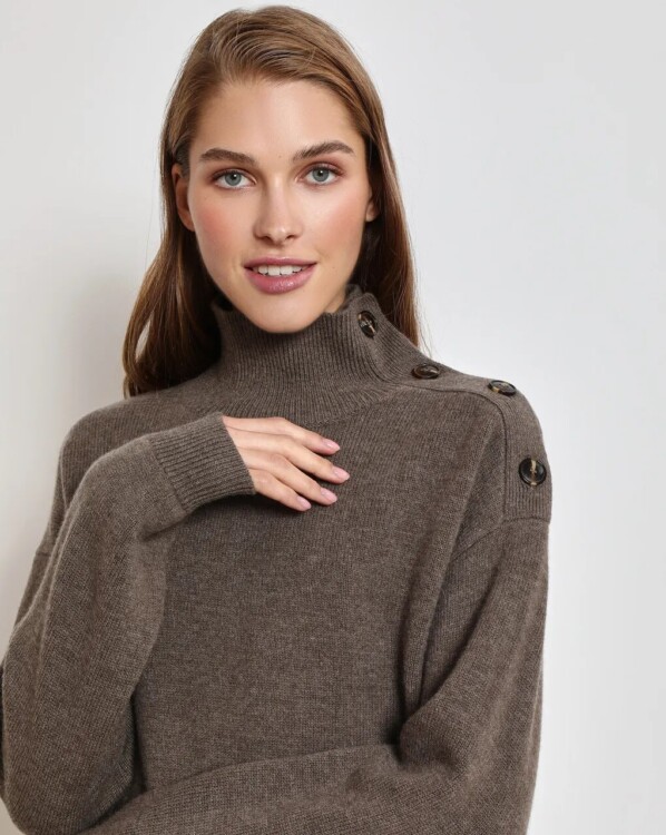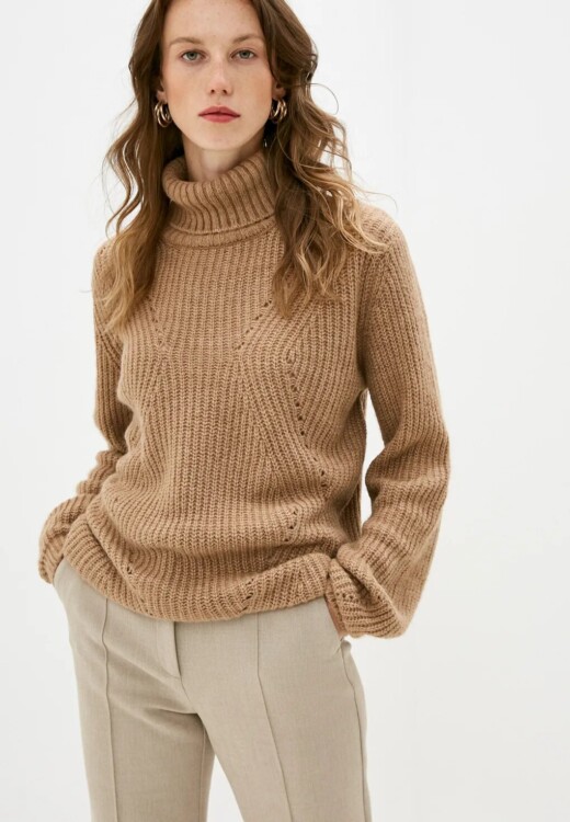 Найтеплішою річчю взимку у вашому гардеробі стане вовняний светр з високим горлом. Можливо, він буде коштувати трохи дорожче, аніж моделі з акрилу, але свою ціну він повністю виправдає. Ідеальний варіант – светр зі 100% вовни або кашеміру, але якщо такого не знайшлося, підійдуть і моделі, в складі яких 30-50% вовни. Головна перевага светрів з натуральних матеріалів в тому, що вони дуже м’які і легкі, але в той же час добре гріють. Зверніть увагу на цю модель універсального коричневого кольору. Такий светр добре виглядає з будь-яким низом, а також стане модною базою під піджаки в чоловічому стилі і куртки-сорочки.