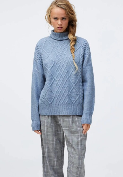 Додайте фактуру образу за допомогою светру з в’язаними візерунками у вигляді ромбів, кіс, квіткових мотивів або орнаментів. Наприклад, цей небесно-блакитний светр стане вдалим доповненням до базових джинсів або плісированих спідниць міді. Однак при покупці варто пам’ятати важливий момент: візерунок на виробі не повинен бути занадто об’ємним, інакше ви ризикуєте візуально додати собі пару зайвих кілограмів.