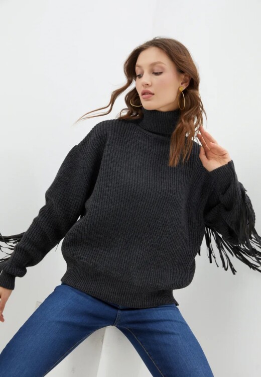Бахрома стала одним з ключових трендів поточного сезону. У дизайнерських колекціях осені-зими – 2020/21 були представлені речі та аксесуари з такою обробкою, в тому числі і светри. Ми підібрали для вас чорний светр з високим горлом, прикрашений бахромою на спині і по всій довжині рукавів. Така проста і зрозуміла, але в той же цікава річ розбавить повсякденні луки і додасть їм шику. Носіть светр з джинсами або елегантними брюками кожен день, а якщо має бути вечірка, комбінуйте його з атласною спідницею в білизняному стилі і взуттям на високих підборах.