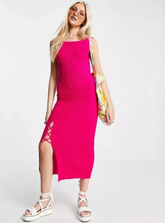 Якщо хочете бути в центрі уваги, вибирайте яскраво-рожеву сукню з пікантним розрізом збоку. Кращим доповненням до неї стануть білі босоніжки і фактурна сумка з масивним ланцюгом.