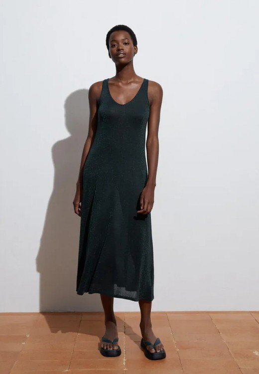 Для комфортних мінімалістичний образів вибирайте вільну сукню з блискучого трикотажу. Доповнюйте її взуттям на товстій підошві і сумкою-кошиком.