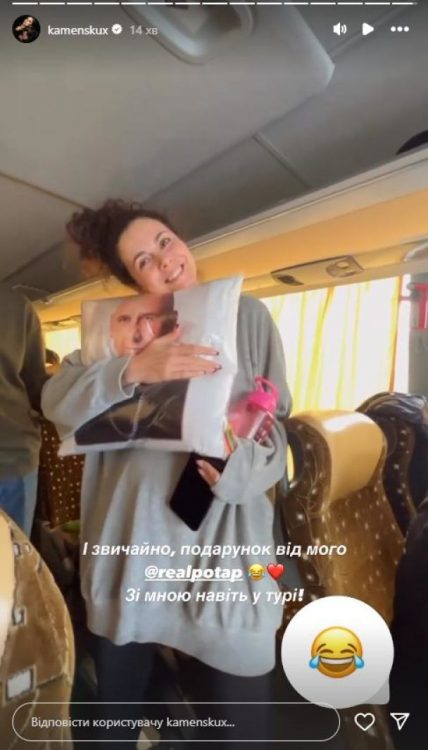 Як виявилось, чоловік подарував Насті Каменських подушку зі своїм зображенням. Зірка українського шоу-бізнесу була приємно здивована таким сюрпризом. За словами співачки, подушка із зображенням чоловіка дуже їй сподобалась. Також вона похизувалась подарунком в Instagram-stories.