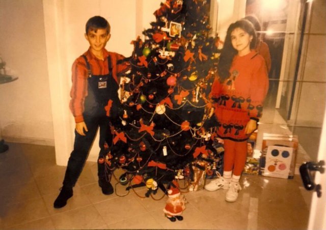 На них Настя Каменських ще зовсім крихітка. На фоні пишної красивої ялинки співачка позує в червоній сукні. На голові в неї мила кучерява зачіска, а поряд стоїть друг дитинства.