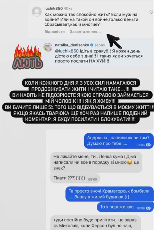 Також хейтери заявили, що знаменитість надто радісна як для дружини військового. Такі слова неабияк розізлили Наталію Денисенко. Акторка відразу відповіла хейтерам. В Instagram-stories вона опублікувала скріншот листування зі своїм чоловіком.