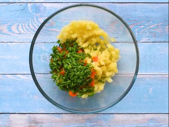 Бульби картоплі слід обполоснути, почистити і розрізати на скибочки. Відварити до м’якості. Морквину очищають від шкірки, споліскують. Ріжуть на шматочки дрібного розміру. Варять до готовності в окремій посудині. Зелену цибулю слід подрібнити. Картоплю розминають. З’єднують з морквою. Додають цибулю, сіль.