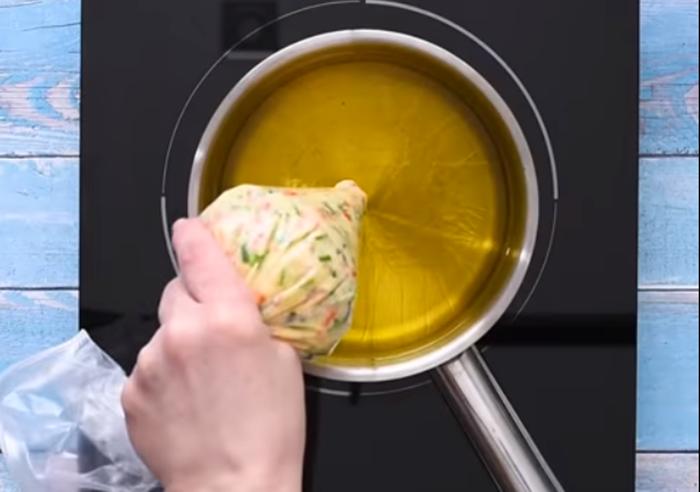 Перекладають масу в поліетиленовий мішок. Відрізають великий шматок від кута пакета. Видавлюють маленькі крокети в глибоку посудину з розігрітою рослинною олією.