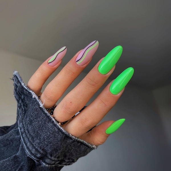 Найчастіша асоціація, яка виникає коли ми говоримо про неон – яскраво-зелений. Особливо добре він поєднується із чорним. На три нігті нанесіть зелений, а решту покрийте базою і виведіть плавні елементи цими двома відтінками.