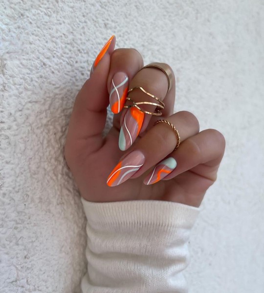 Якщо ви хочете яскравий манікюр але поки що не готові до повного покриття, цей варіант для вас! У цьому дизайні поєднуються неоновий помаранчевий, білий та небесно-блакитний. Намалюйте з їх допомогою дизайн з хвилястих ліній та радуйтесь стильному манікюру!